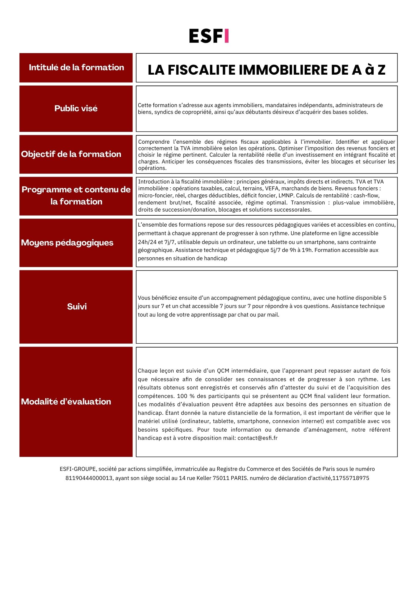- Cette formation a pour objectif d’offrir une maîtrise globale de la fiscalité immobilière sous toutes ses formes.