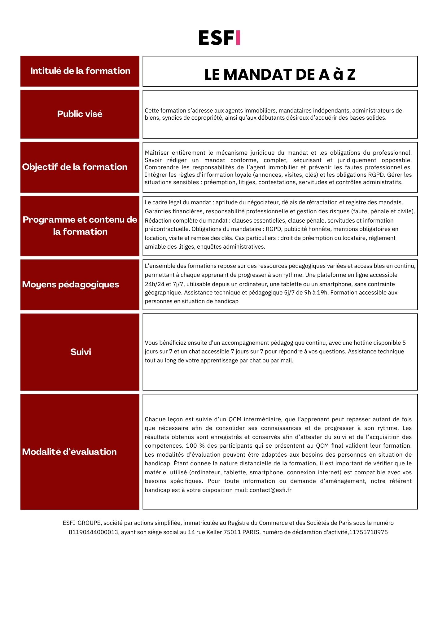 - La formation « Tout savoir sur le mandat immobilier » a pour objectif de permettre aux professionnels de l’immobilier d’acquérir une maîtrise complète de ce document fondamental, véritable socle juridique de leur activité.