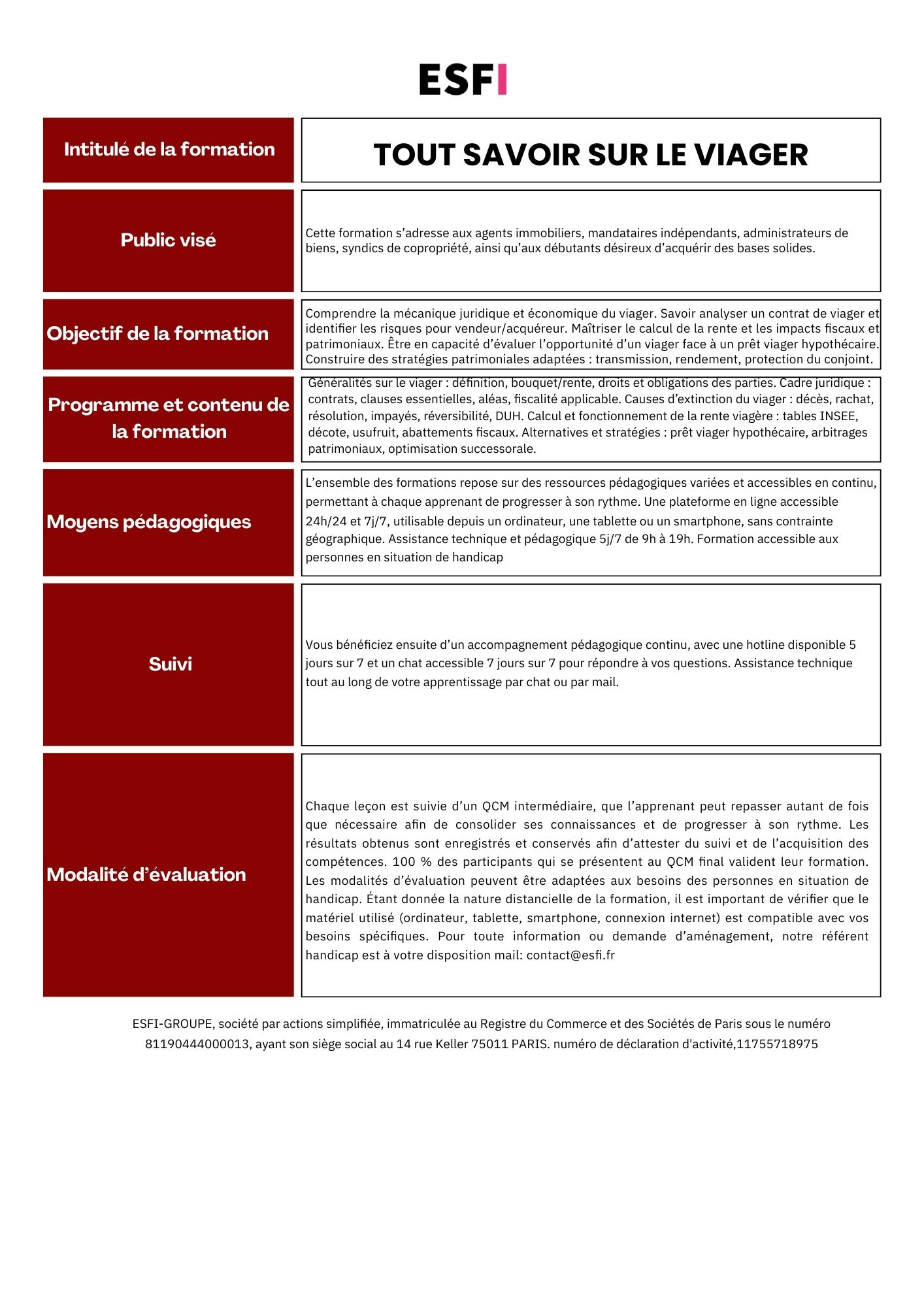 - L’objectif final est de former des professionnels capables de négocier, structurer et valoriser un viager en toute sécurité juridique et financière, tout en tenant compte des enjeux humains liés à ce type de transaction.
